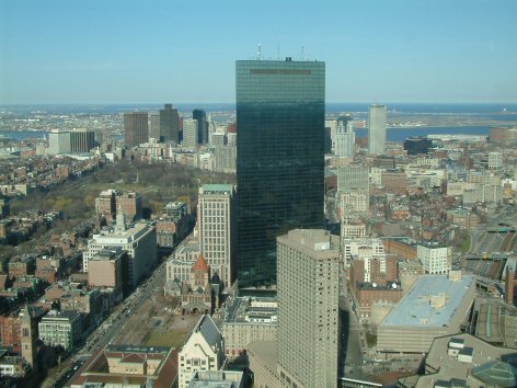 Hancock Tower darunter die Trinity Church am Copley Square. Links im Hintergrund Downtown vor dem Park Boston Common.