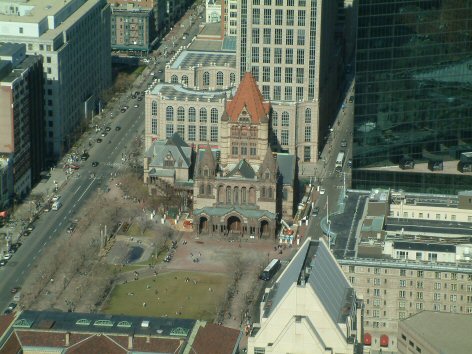 Die Trinity Church wird beschrieben als "Romanesque Revival Church", erbaut zwischen 1872 bis 1877. Der Architekt Henry Hobson Richardson strebte mit dem Stil der Trinity Church bewusst einen scharfen Kontrast zum zeitgenössischen viktorianisch-gothischen Stil an. Back Bay entstand auf Marschland, das mit Kies aus Needham aufgeschüttet wurde. Die statischen Überlegungen beim Entwurf der Kirche mussten diese Gegebenheiten des Untergrundes berücksichtigen. Die Trinity Church steht auf vier großen Granit-Pyramiden und einem Pfahlwerk aus 4000 Holzpfählen. |